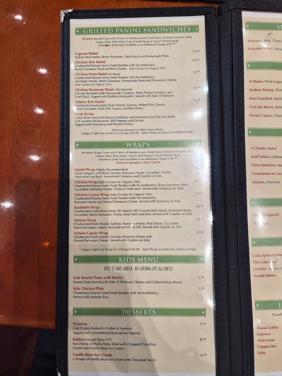Complementing the main dishes are an array of homemade sides and spreads—from creamy classic hummus to the zesty spicy red bell pepper variant, and cooling tzatziki—all crafted with care and bold flavors. Generous salads and falafels round out the experience, creating a balanced Mediterranean feast. The welcoming atmosphere and attentive service amplify the dining experience, making Panini Kabob Grill a standout destination for lovers of genuine, fresh Mediterranean cuisine.